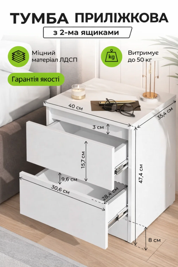 Брала для невеликої спальні. Розмір підійшов ідеально. Ящики місткі, відкриваються нормально. За свою ціну — хороший варіант.
